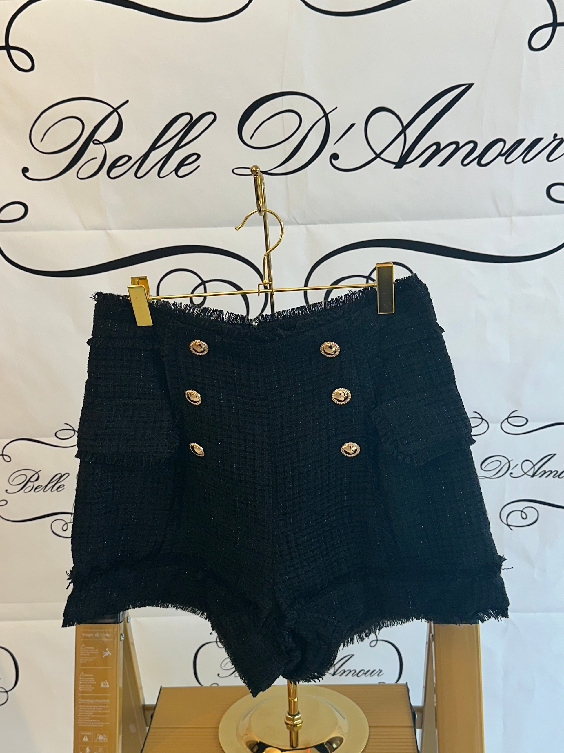 Frayed Edges Tweed Shorts with side faux pocket flaps. 6 gold front buttons, back zipper closure.