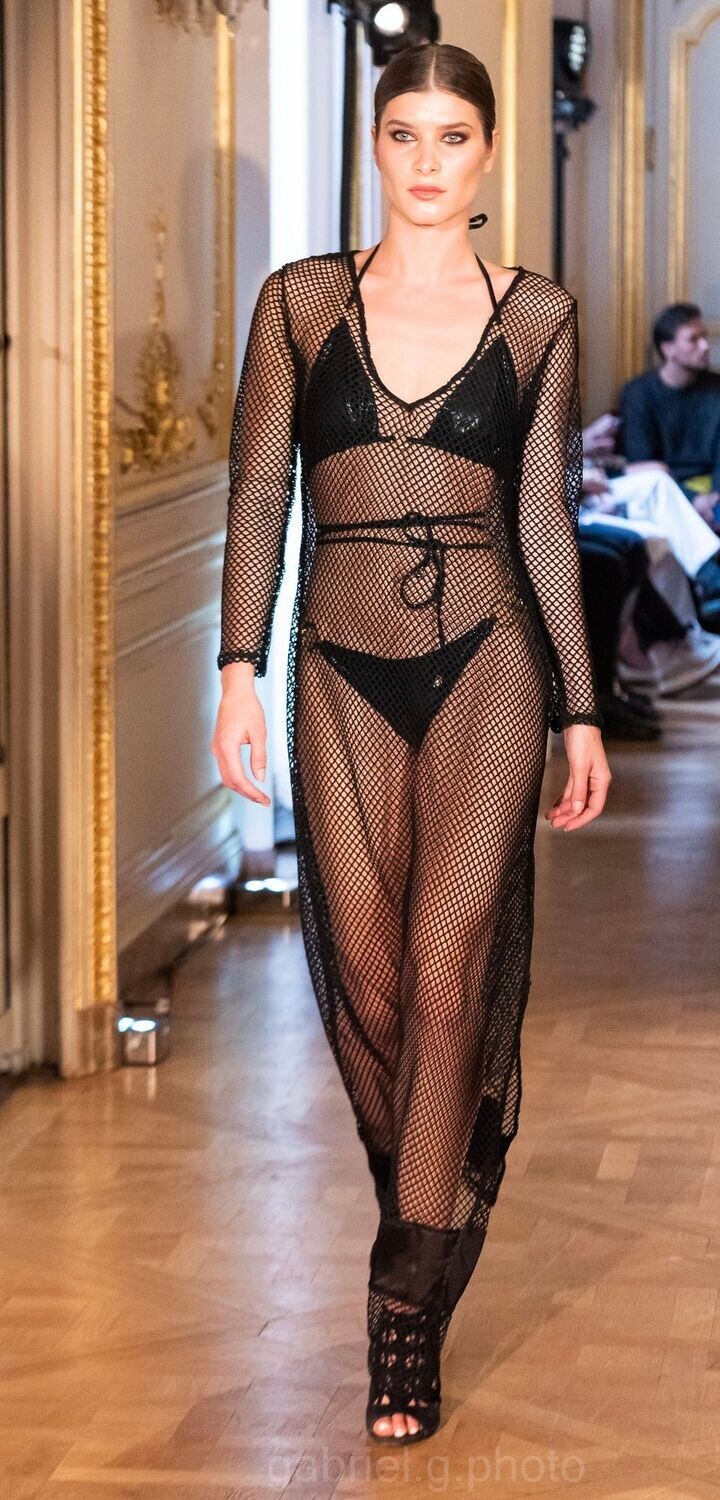 The Aurora Black Net Cover-Up is a truly spectacular piece, designed to make a statement. Featuring a sultry side slit and a flattering V-neck, this cover-up combines elegance with allure. The long sleeves add a touch of sophistication, while the black satin strip along the bottom provides a luxurious finish. This cover-up is perfect for layering over your favorite swimwear, offering both style and comfort for any beach or poolside occasion.