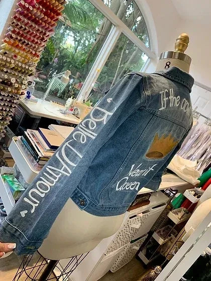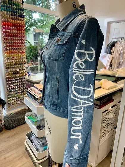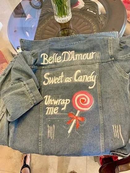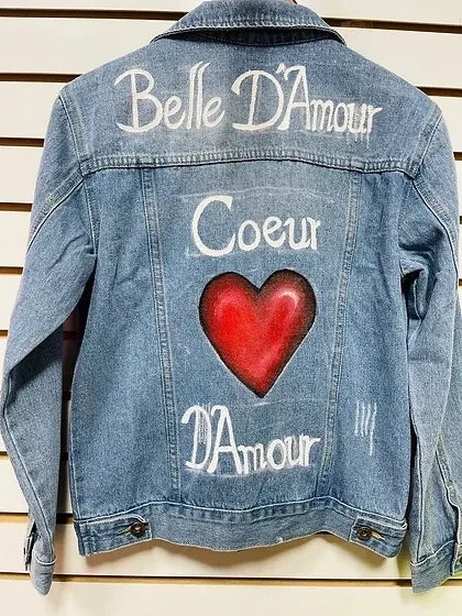 The Belle D’Amour Denim Special Jacket is as unique as you. Each one has something special and is a limited quantity collection. They are a lot of fun and all hand painted by a local artist.